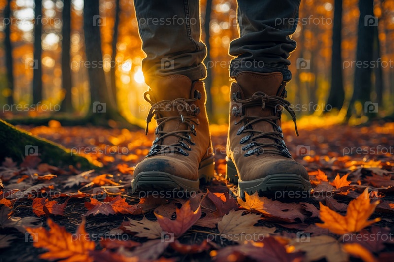 Турист, идущий по красно-желтым листьям осенью в природном парке и лесу ближайшие обувь AI Generative