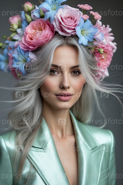 Портрет Молодая женщина естественный чистый помада макияж модная модель красота в цветах ИИ генеративная