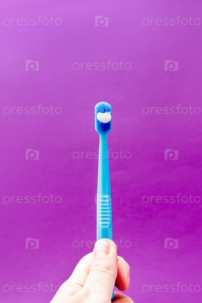 Рука, удерживающая голубую зубную щетку с белой пастой Смазанной, креативная Пустая копия Пространство для текста, Здоровый оральный рот Концепция