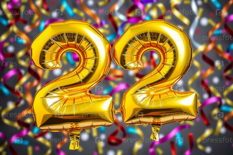 Гелийный день рождения шарик формы номер двадцать два, золотая буква фигура 22 праздник праздничный фон