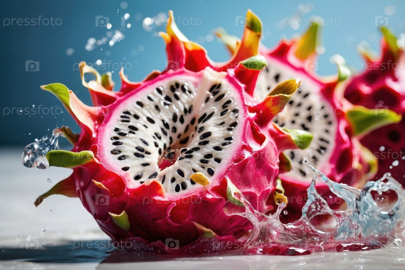 AI Generative Экзотические фрукты плоды дракона в распылении воды на летнем бассейне фон отпуска