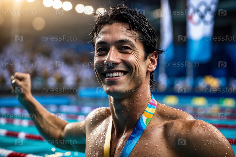 Награждение победителей чемпионов по спорту плавать в бассейне, летние Олимпийские игры соревнования AI Generative