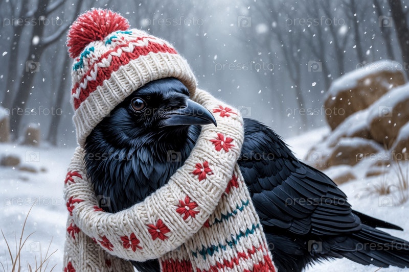 AI Generative Crow портрет ворона в вязанной зимней одежде шляпе и шарфе, животное при снегопаде зимой