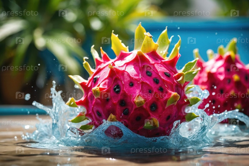 AI Generative Экзотические фрукты плоды дракона в распылении воды на летнем бассейне фон отпуска