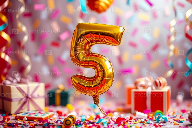 Гелиевый баллон на день рождения в форме числа пять, фигура золотой буквы 5 на фоне праздничного торжества