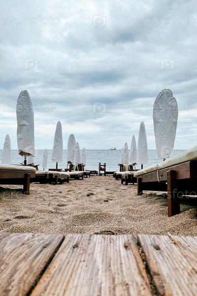 Пустой пляж Адриатического моря пасмурный день, солнечные зонтики сложены кресла сняты