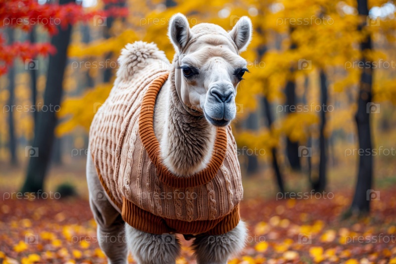 Верблюд в вязанном свитере осенний лесный фон, животное в красно-желтых листьях AI Generative