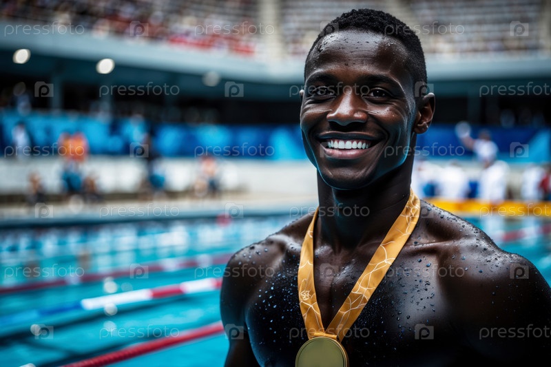 Награждение победителей чемпионов по спорту плавать в бассейне, летние Олимпийские игры соревнования AI Generative