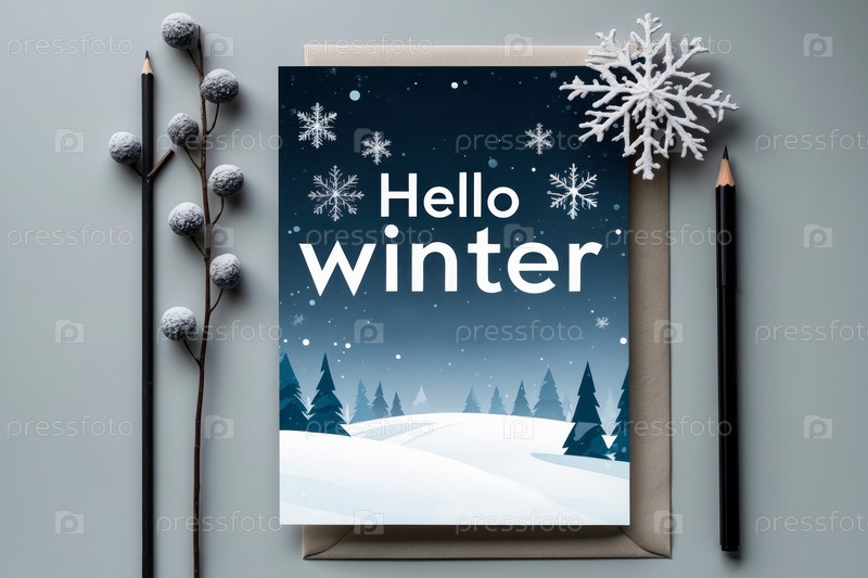 Баннер поздравительной открытки с надписью Здравствуйте, зима на фоне снежного леса AI Generative
