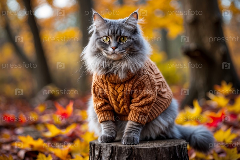 Кошка в трикотажном свитере на фоне осеннего леса, животное в красно-желтых листьях AI Generative