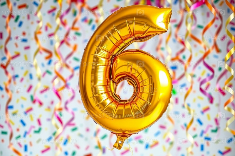 Гелиевый баллон рождения формы номер шесть, фигура золотой буквы 6 на праздновании праздничный фон