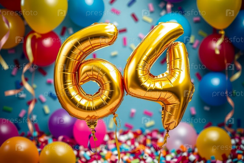 Гелий день рождения воздушный шар номер шестьдесят четыре, золотые буквы фигура 64 праздник праздничный фон