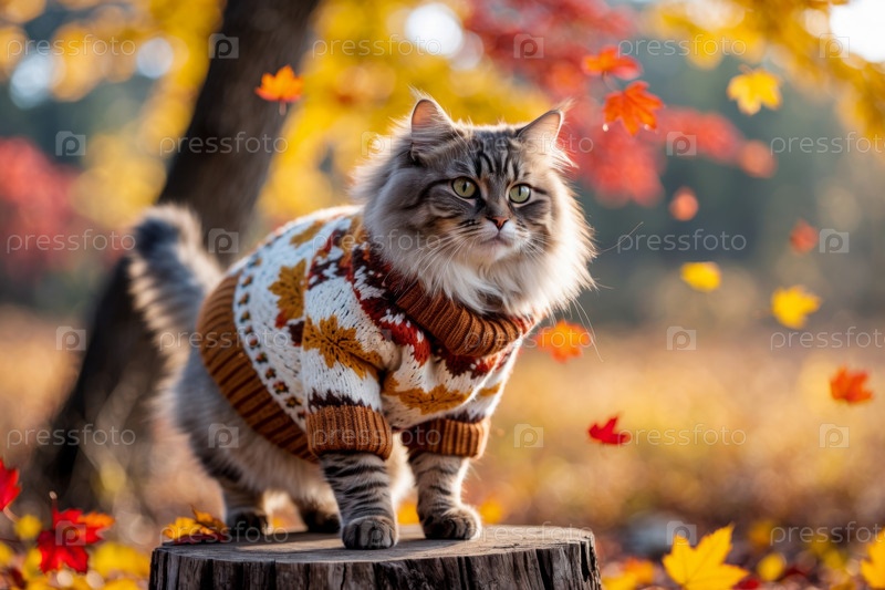 Кошка в трикотажном свитере на фоне осеннего леса, животное в красно-желтых листьях AI Generative