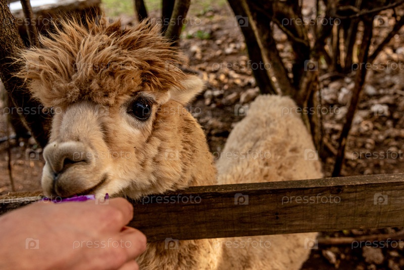 Лама-альпака в просторном падоке на домашней ферме млекопитающих Пастбище луга с травой на открытом воздухе