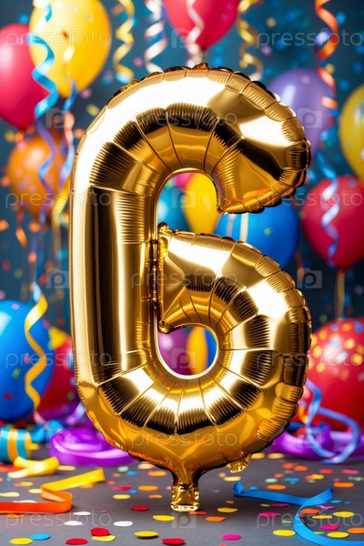 Гелиевый баллон рождения формы номер шесть, фигура золотой буквы 6 на праздновании праздничный фон