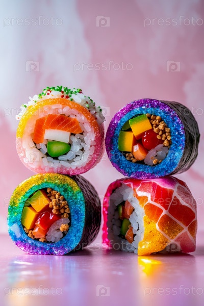AI Generative Abstract необычное творческое искусство суши роллы фрукты декоративная радуга блеск фантастическая еда