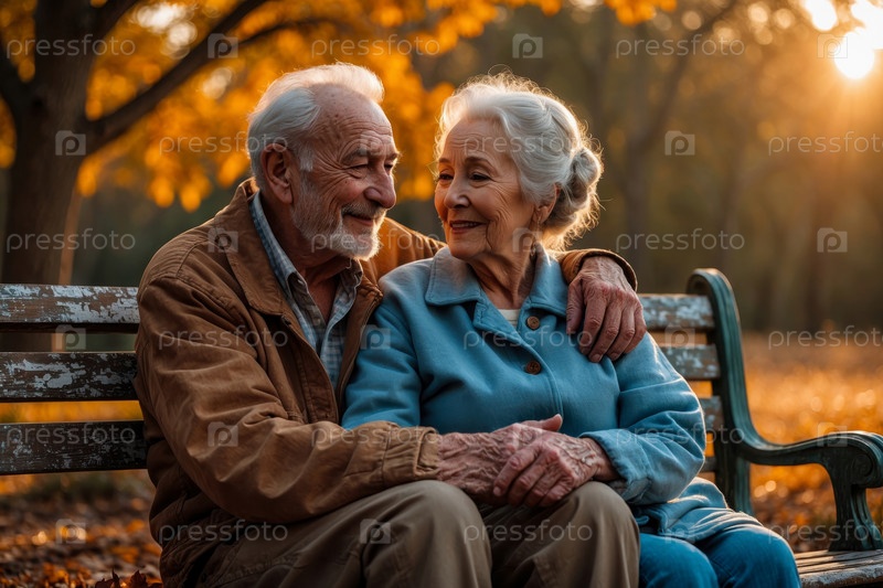 Женатая пара пожилая женщина и мужчина гуляют в осеннем парке, семья на заднем плане падающие листья AI Generative