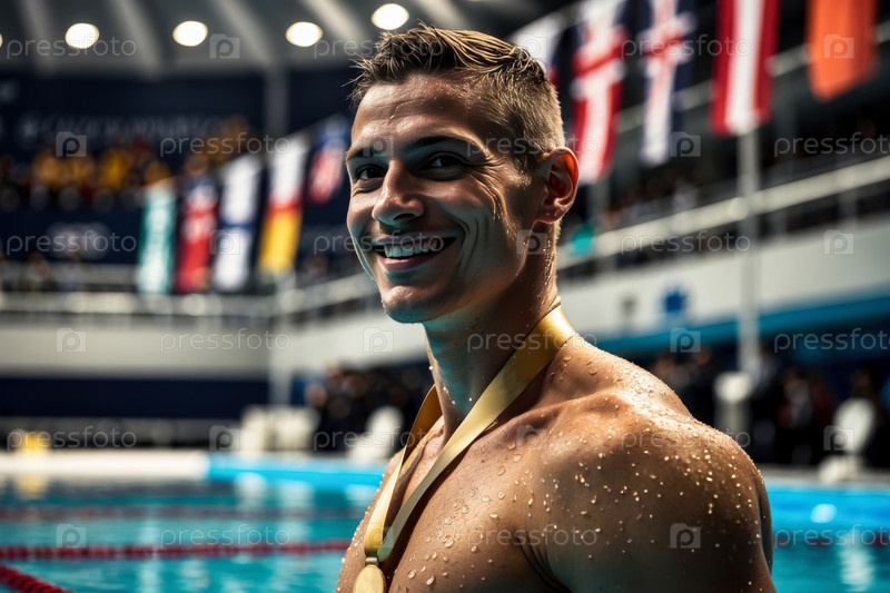 Награждение победителей чемпионов по спорту плавать в бассейне, летние Олимпийские игры соревнования AI Generative