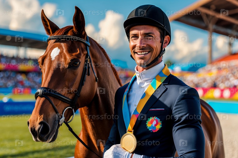 Человек-жокей в гонках на ипподроме спортивные скачки лошадей, летние Олимпийские игры соревнования AI Generative