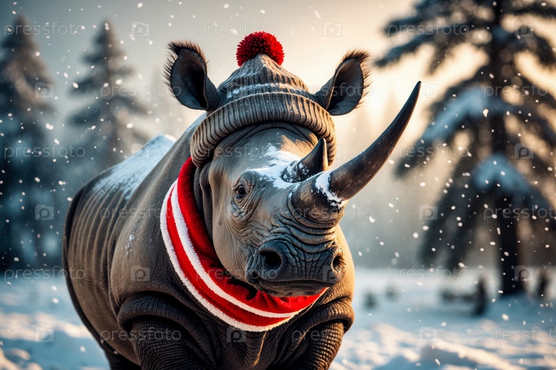 Генеративный портрет носорога в вязанной зимней одежде шляпе и шарфе, животное при снегопаде зимой AI