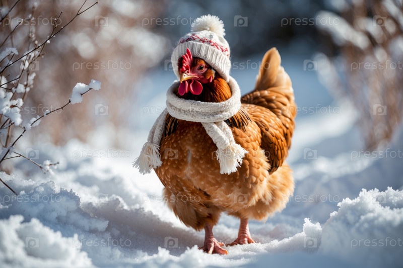 AI Generative Портрет курицы в вязанной зимней одежде шляпе и шарфе, животное в снежных дождях зимой