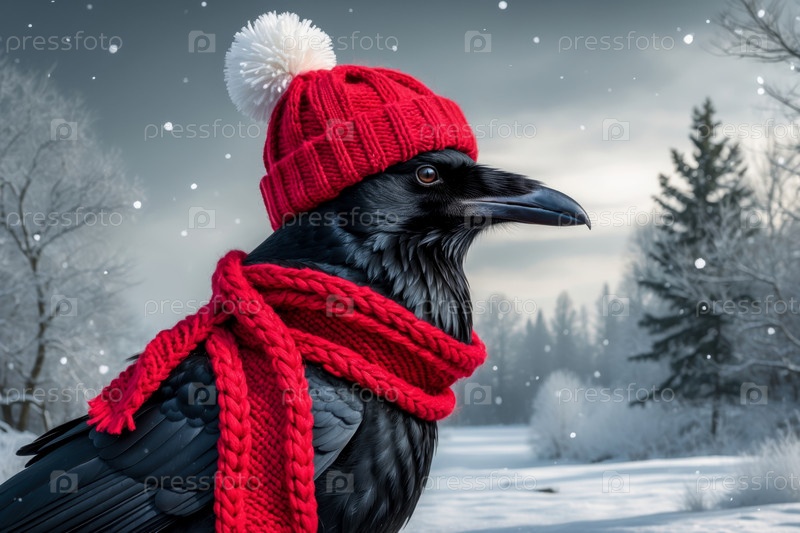 AI Generative Crow портрет ворона в вязанной зимней одежде шляпе и шарфе, животное при снегопаде зимой