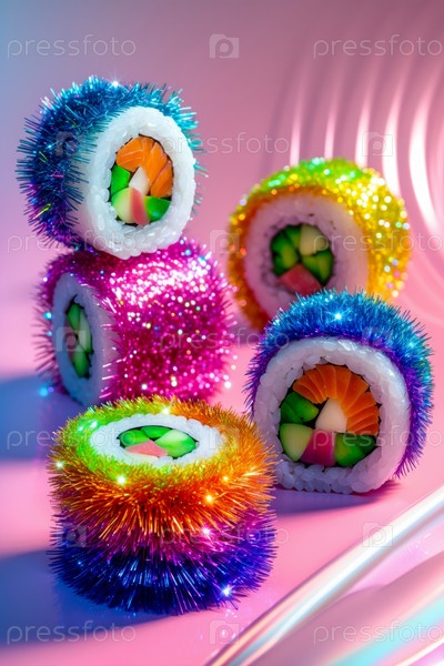 Abstract необычное творческое искусство суши рулон фруктов декоративная радуга блеск фантастическая еда генеративное ИИ