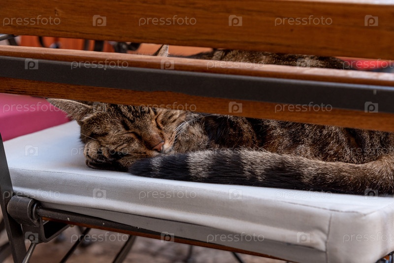 Бездомный пушистый волосатый смешной домашний кот животный, свернувшийся и спящий на стуле в кафе