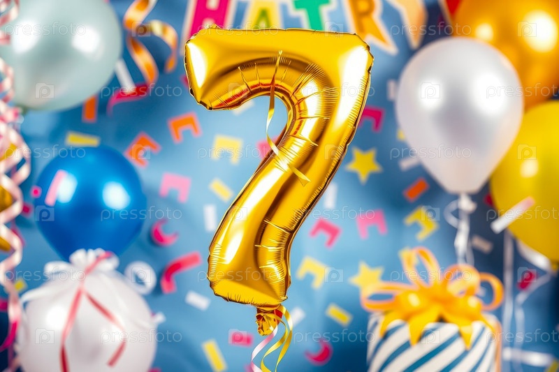 Гелиевый баллон рождения формы номер семь, фигура золотой буквы 7 на праздновании праздничный фон