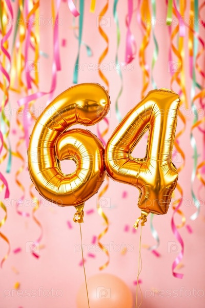 Гелий день рождения воздушный шар номер шестьдесят четыре, золотые буквы фигура 64 праздник праздничный фон