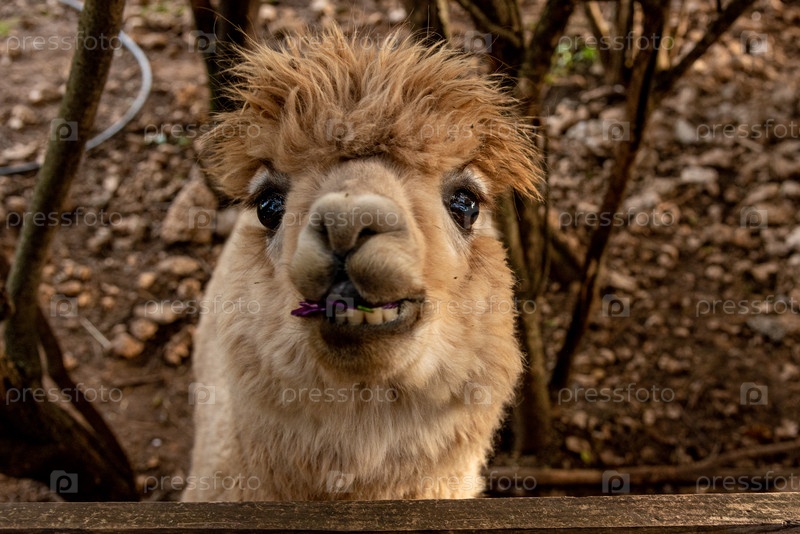 Лама-альпака в просторном падоке на домашней ферме млекопитающих Пастбище луга с травой на открытом воздухе
