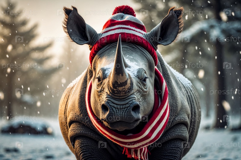 Генеративный портрет носорога в вязанной зимней одежде шляпе и шарфе, животное при снегопаде зимой AI