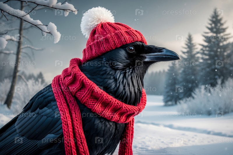 Портрет ворона в вязанной зимней одежде, шляпе и шарфе, животное на мокром снеге зимой AI Generative