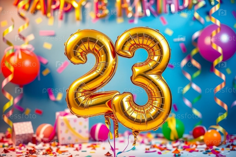 Гелийный день рождения шарик формы номер двадцать три, золотая буква фигура 23 праздник праздничный фон