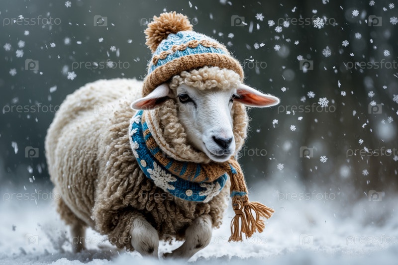 AI Generative Овенский портрет в вязанной зимней одежде шляпе и шарфе, животное в снежных дождях зимой