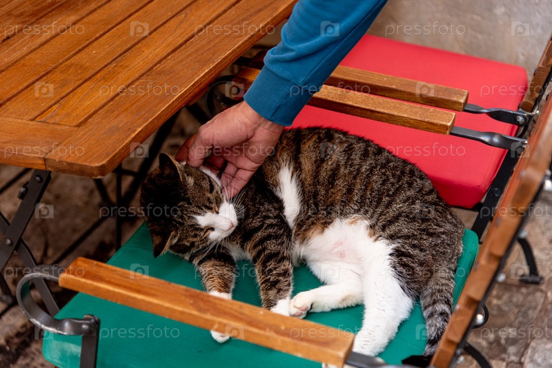 Персона гладит милого пушистого безымянного недоношенного кота, домашнего питомца бездомного, гуляющего снаружи