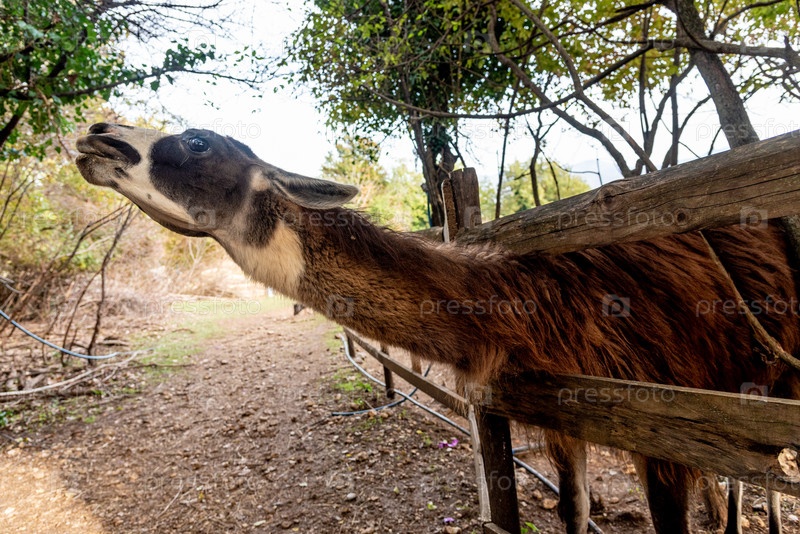 Лама-альпака в просторном падоке на домашней ферме млекопитающих Пастбище луга с травой на открытом воздухе