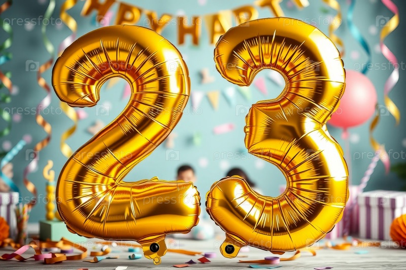 Гелийный день рождения шарик формы номер двадцать три, золотая буква фигура 23 праздник праздничный фон