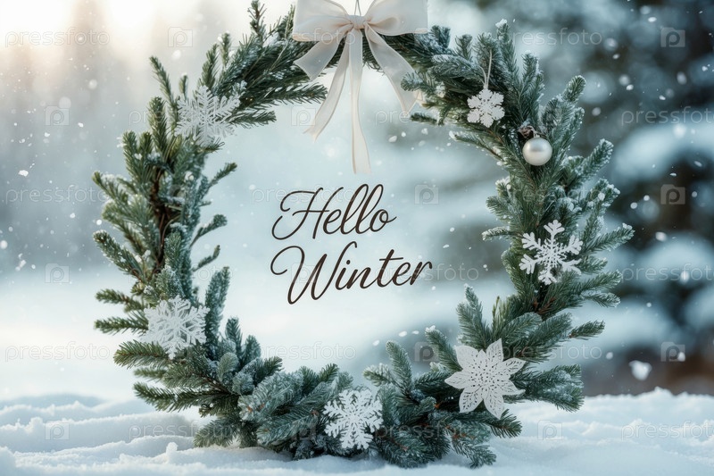Баннер поздравительной открытки с надписью Здравствуйте, зима на фоне снежного леса AI Generative