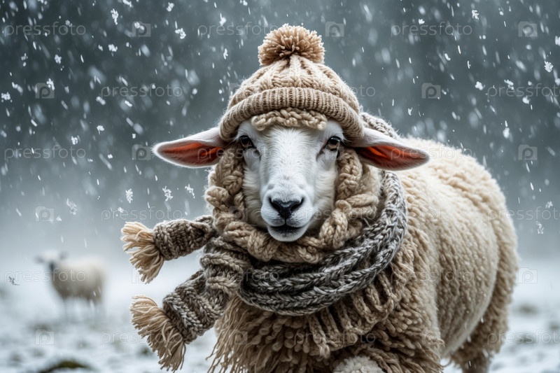AI Generative Овенский портрет в вязанной зимней одежде шляпе и шарфе, животное в снежных дождях зимой