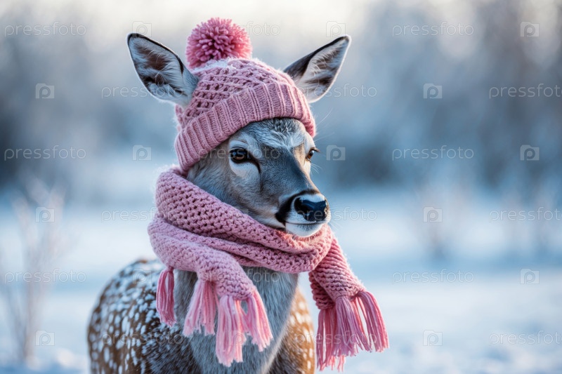 AI Generative Портрет оленя в вязанной зимней одежде шляпе и шарфе, животное в снежных дождях зимой