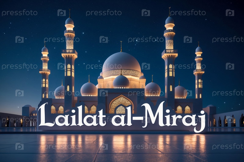 AI Generative Поздравления по случаю исламского праздника Лайлат аль-Мирадж, мечетей с минаретами на фоне звездного ночного неба и полумесяца