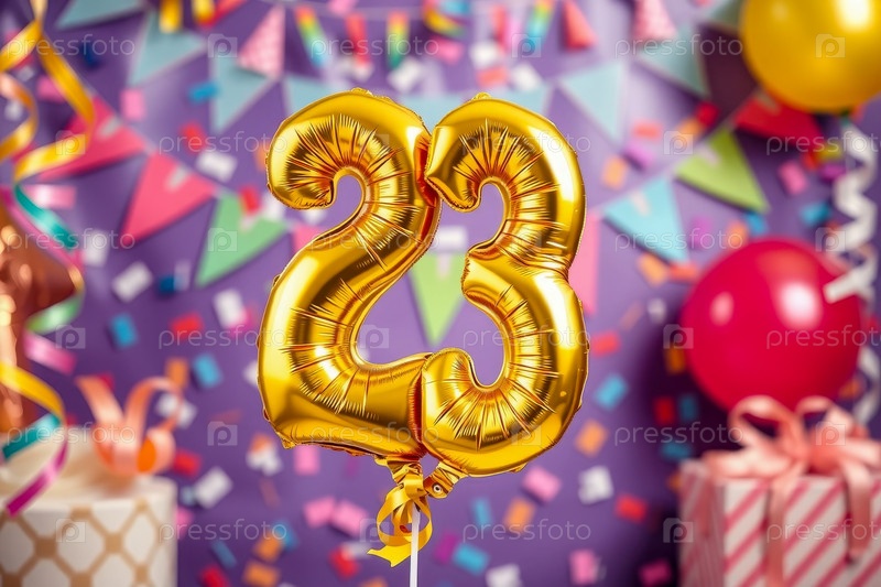 Гелийный день рождения шарик формы номер двадцать три, золотая буква фигура 23 праздник праздничный фон