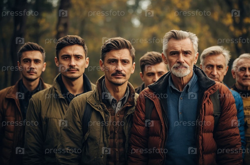 Старые мужчины с осенней непринужденной городской одеждой снаружи, портрет парней образ жизни ИИ генеративная группа