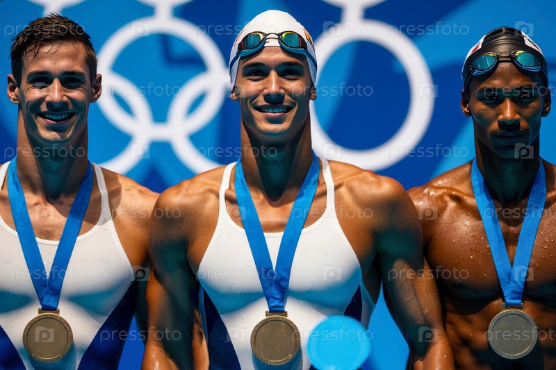 Награждение победителей чемпионов по спорту плавать в бассейне, летние Олимпийские игры соревнования AI Generative