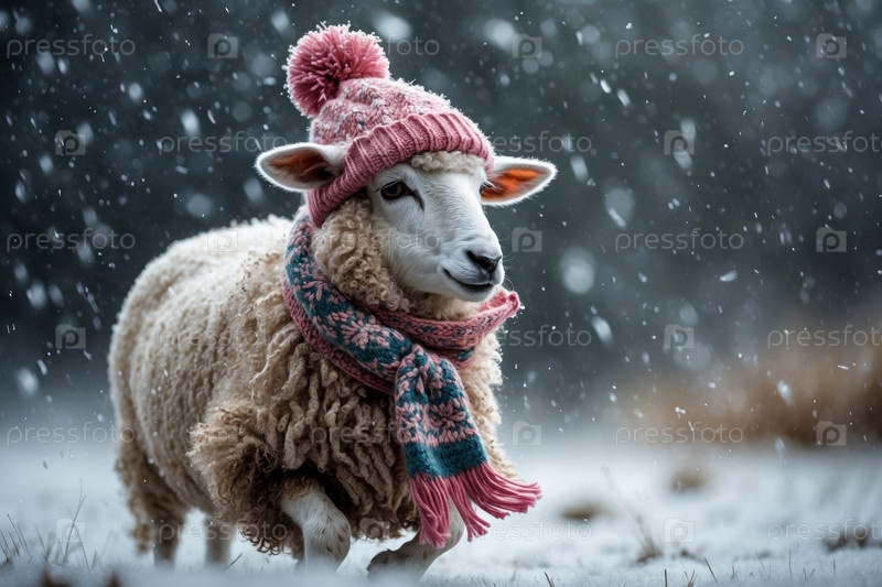 AI Generative Овенский портрет в вязанной зимней одежде шляпе и шарфе, животное в снежных дождях зимой