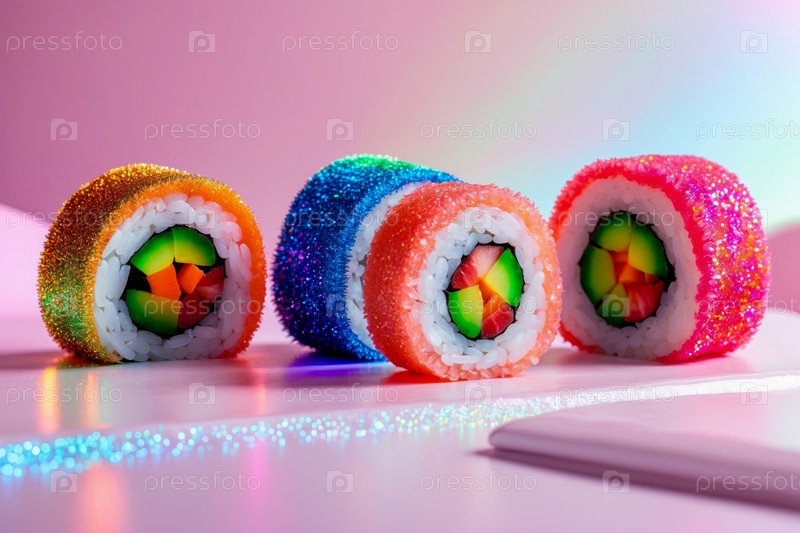 Abstract необычное творческое искусство суши рулон фруктов декоративная радуга блеск фантастическая еда генеративное ИИ