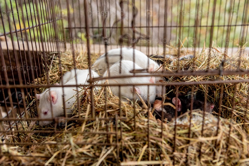 Белые крысы с красными глазами в клетке, мыши домашние грызуны сидят на сухой траве сена