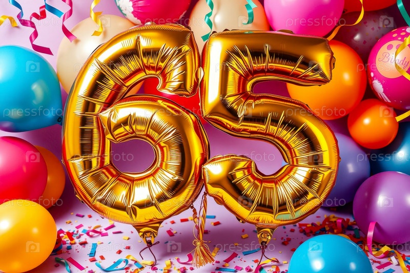 Гелийный день рождения баллон номер шестьдесят пять, фигура золотой буквы 65 праздник праздничный фон