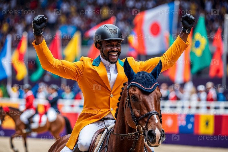 Человек-жокей в гонках на ипподроме спортивные скачки лошадей, летние Олимпийские игры соревнования AI Generative